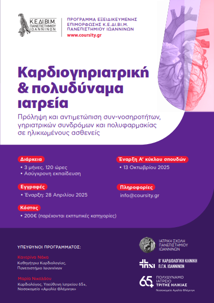 Το Πρόγραμμα Εξειδικευμένης Επιμόρφωσης με τίτλο: Καρδιογηριατρική και πολυδύναμα ιατρεία: Πρόληψη και αντιμετώπιση συν-νοσηροτήτων, γηριατρικών συνδρόμων και πολυφαρμακίας σε ηλικιωμένους ασθενείς διεξάγεται από το Κ.Ε.ΔΙ.ΒΙ.Μ. Παν. Ιωαννίνων.
