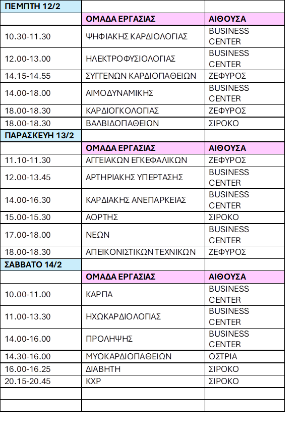 | Κατά τη διάρκεια των Σεμιναρίων των Ομάδων Εργασίας 2026, που θα διεξαχθούν 12-14 Φεβρουαρίου 2026 στη Θεσσαλονίκη στο Ξενοδοχείο The MET, θα διεξαχθούν και οι αρχαιρεσίες ανάδειξης των νέων πυρήνων των Ομάδων Εργασίας. Με την ευκαιρία αυτή θα θέλαμε να σας ενημερώσουμε ότι: · Έχετε επιλογή συμμετοχής σε μέχρι τρεις (3) ομάδες · Μπορείτε να είστε υποψήφιοι μόνο σε μια ομάδα · Καταληκτική ημερομηνία εγγραφής νέων μελών στις ομάδες είναι η 12η Ιανουαρίου 2026 · Καταληκτική ημερομηνία υποβολής υποψηφιοτήτων είναι η 1η Φεβρουαρίου 2026 · Σημειώνεται ότι τα δόκιμα μέλη μπορούν να θέσουν υποψηφιότητα και να ψηφίσουν μόνο στην ΟΕ Νέων Καρδιολόγων · Στην αίτηση υποψηφιότητας να αναγράφεται η ομάδα και η θέση που επιλέγετε · Όλες οι υποψηφιότητες αποστέλλονται με e-mail στο imetaxa@hcs.gr και στο info@hcs.gr ΠΡΟΓΡΑΜΜΑ ΕΚΛΟΓΩΝ