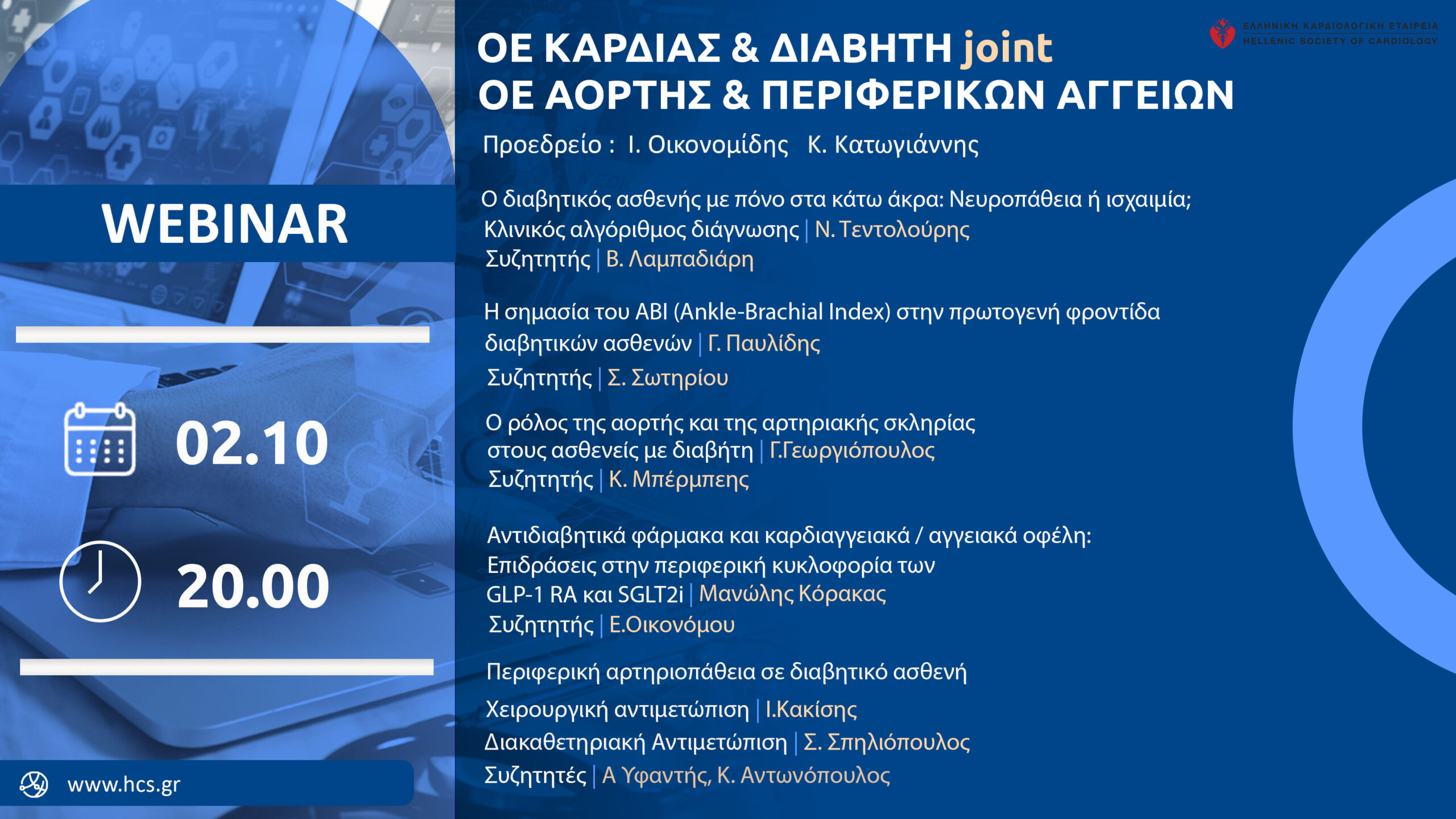 Webinar | Ο.Ε. Καρδιάς Διαβήτη & Ο.Ε. Αορτής και Περιφερικών Αγγείων | Πέμπτη 02 Οκτωβρίου 2025 | 20:00